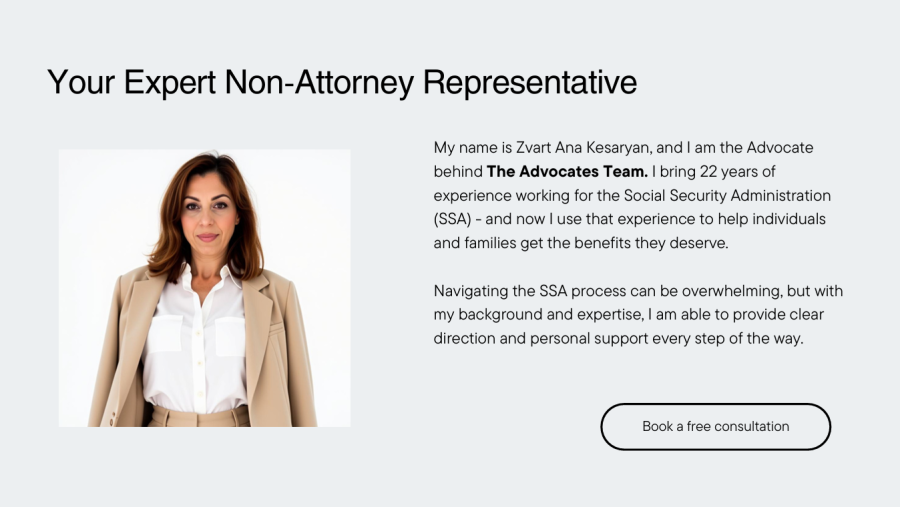 Description: | Zvart Ana Kesaryan – Non-Attorney Representative I provide professional, personalized assistance with Social Security and related benefit programs. With over two decades of experience, I guide clients through complex applications, appeals, and reviews with care and expertise. Services include: