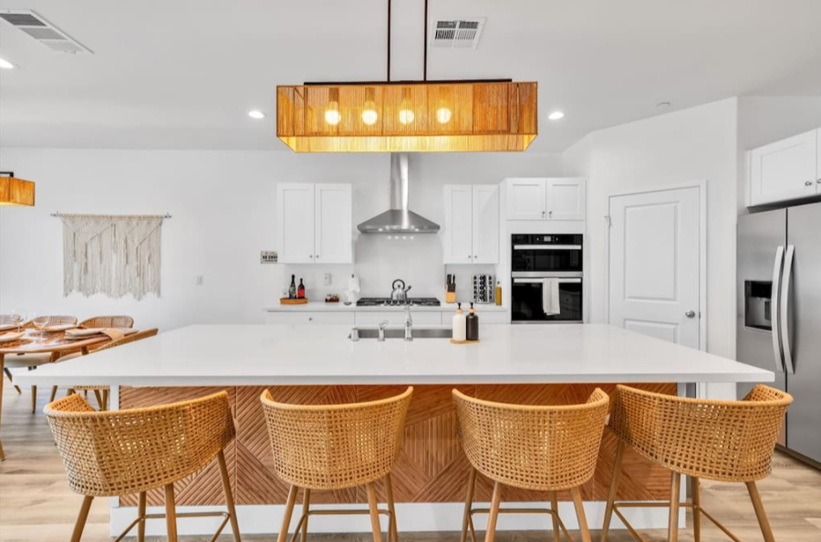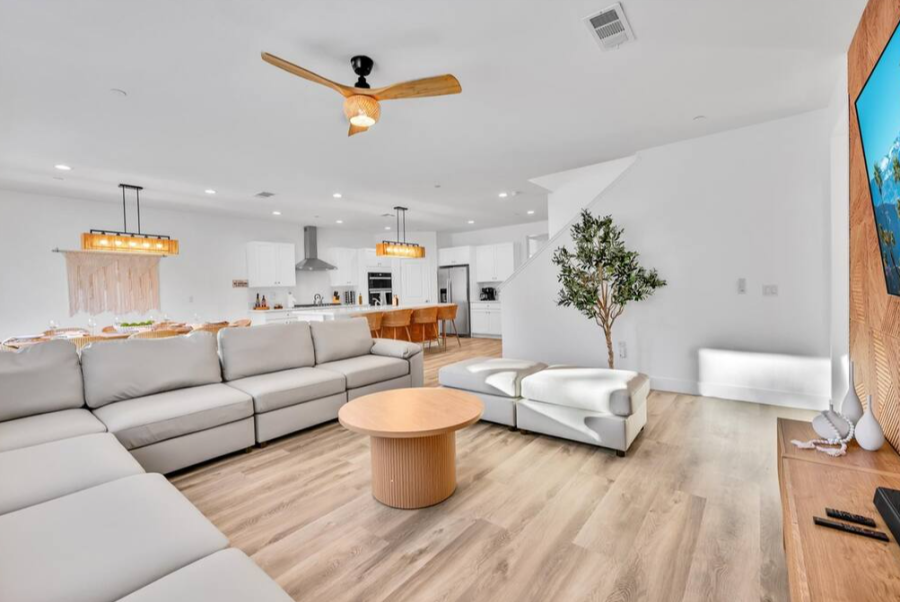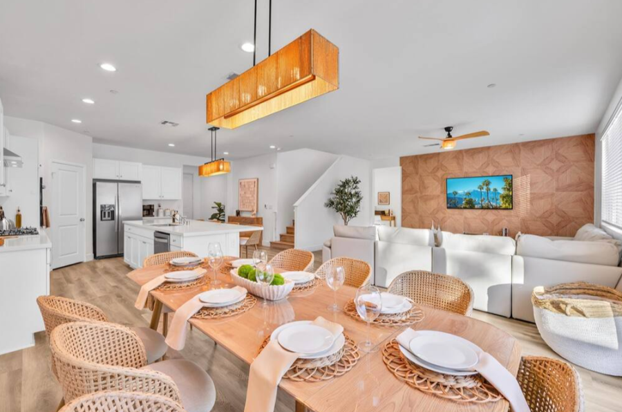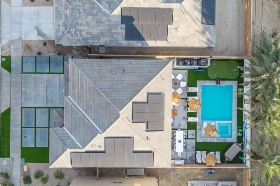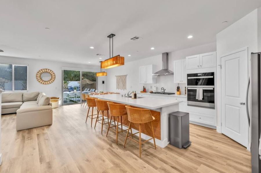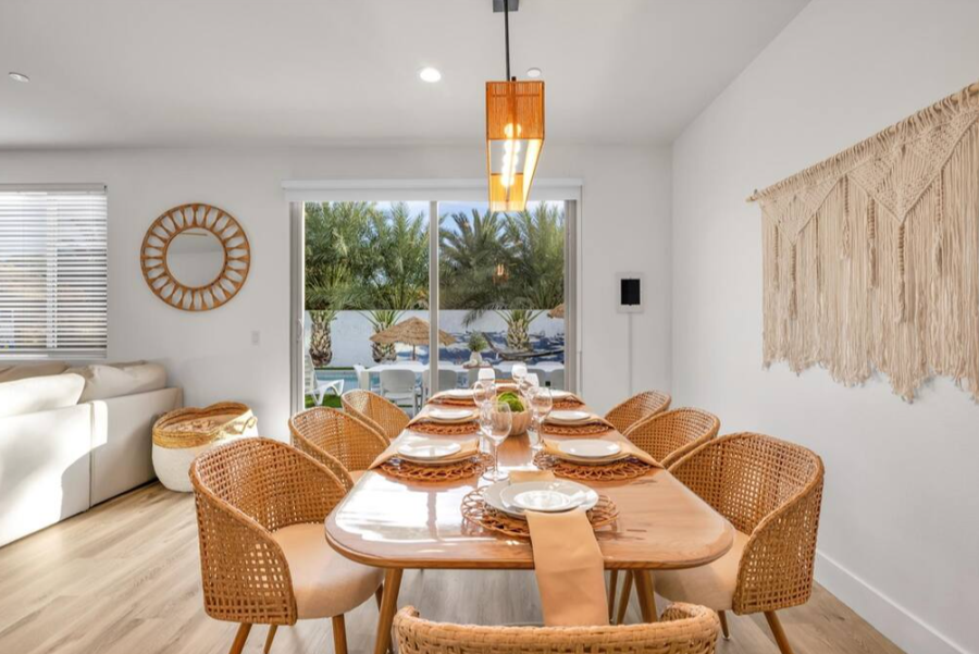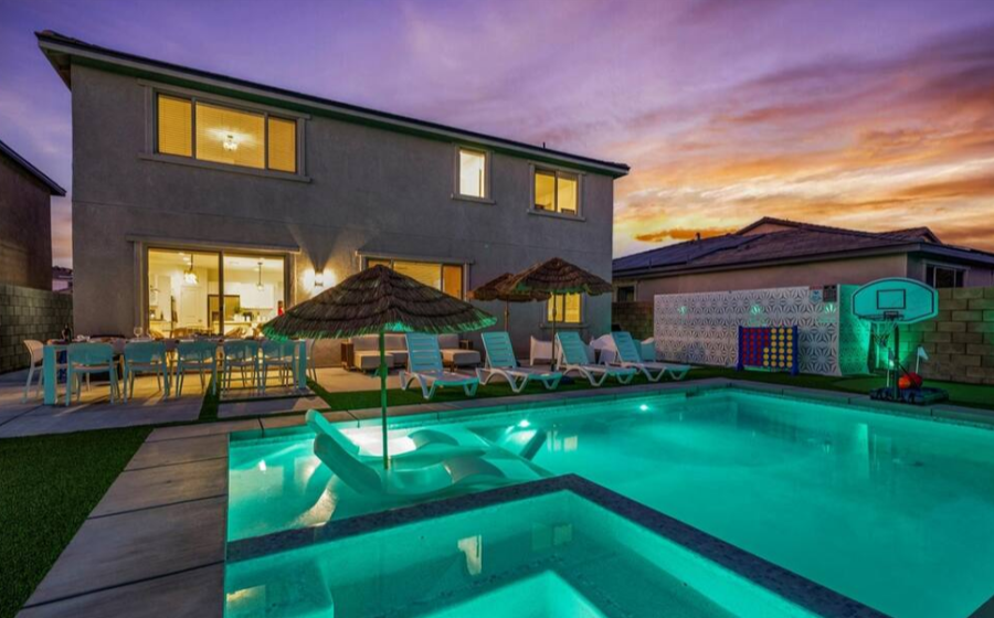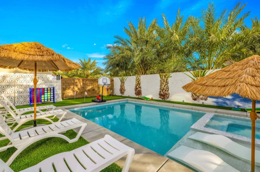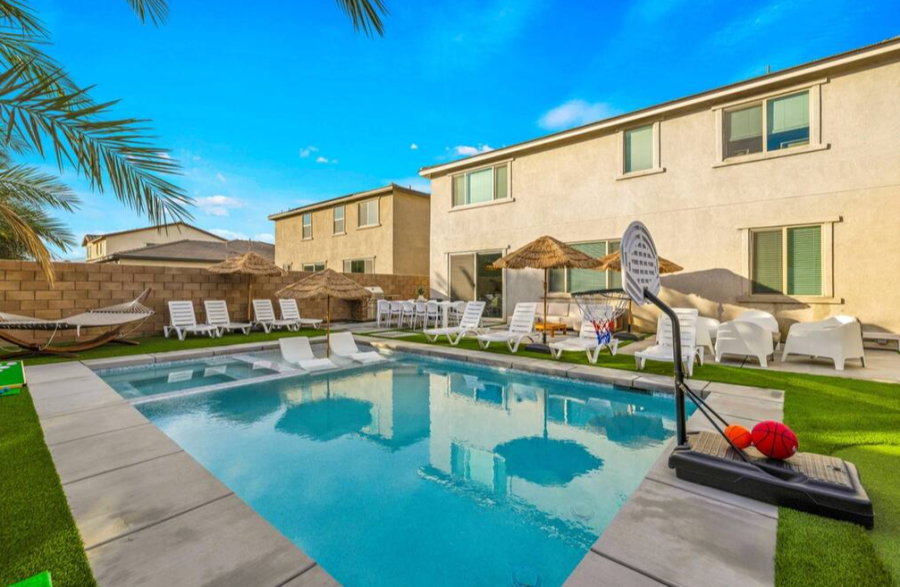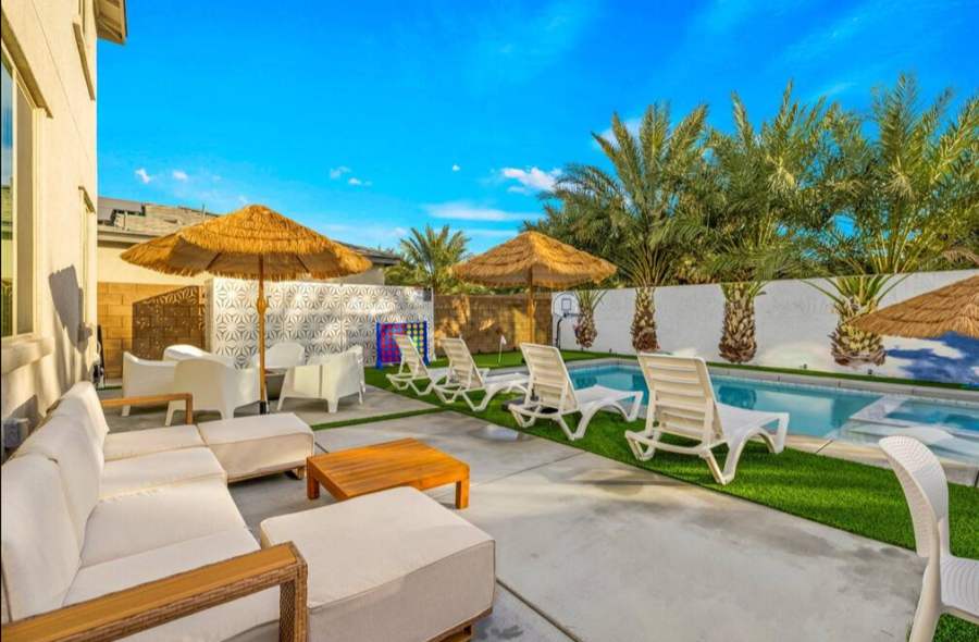 Bella Coachella is the perfect place to enjoy a weekend of fun with your friends and family. This spacious home sleeps up to 24 people with 8 bedrooms. The backyard is equipped with a brand new pool and spa, billiards table,BBQ, firepit, outdoor dining, and ample games. Please note, pool heating costs $150/ day and we need at least 24 hours notice before your arrival. Spa heating is complementary during your stay. |