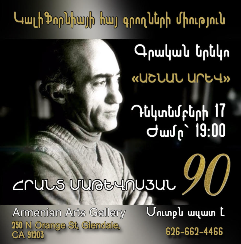 «ԱՇՆԱՆ ԱՐԵՎ» գրական երեկո՝ նվիրված Հրանտ Մաթևոսյանի 90-ամյակին - Glendale, CADate of Post: 12-11-2025 04:22